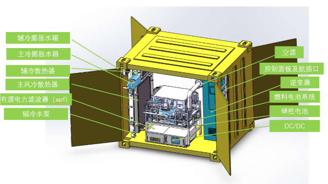 燃料電池電源系統(tǒng)采用撬裝式設(shè)計,主要包括燃料電池發(fā)電模塊、熱管理以及電源管理模塊,根據(jù)功率需求燃料電池電源系統(tǒng)由一個至多個發(fā)電集裝箱組成,提升運輸便利性,滿足高功率等級應(yīng)急用電需求。同時引入了直流母線并網(wǎng)概念,燃料電池電源等發(fā)電單元以及儲能裝置均通過電力變換器裝置接入直流母線,直接向直流負(fù)載供電或者通過逆變器連接至交流電網(wǎng)或交流負(fù)載。大大減少了直流分布式電源和負(fù)載接入電網(wǎng)所需的換流設(shè)備,在降低成本的基礎(chǔ)上提高了電能的利用效率,同時還具備分布置電源和負(fù)荷配置靈活的用電。